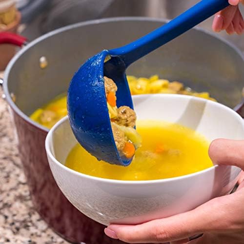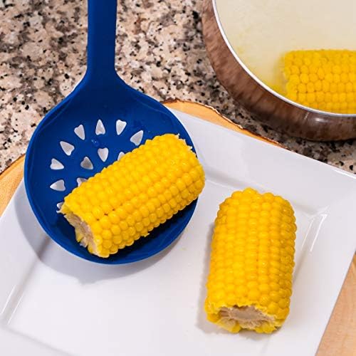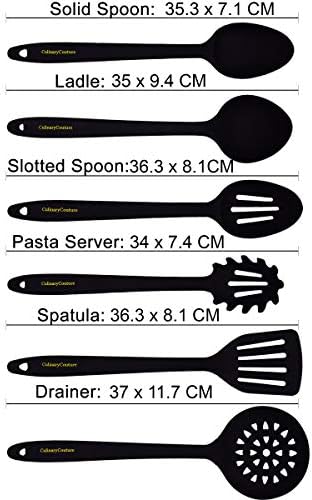 INCLUDES ALL THE ESSENTIALS: Don't be perplexed because this set doesn't include pans and pots. This kitchen utensil set contains a multitasking cooking powerhouse: slotted spoon (13.5"x2.75"), ladle (12.5"x3.5" & 5oz), drainer (14"x4.5"), pasta server (13.5"x2.75"), spatula-turner (14.25"x3.25") and solid serving spoon (13.5"x2.75"). All you need in a modern kitchen!